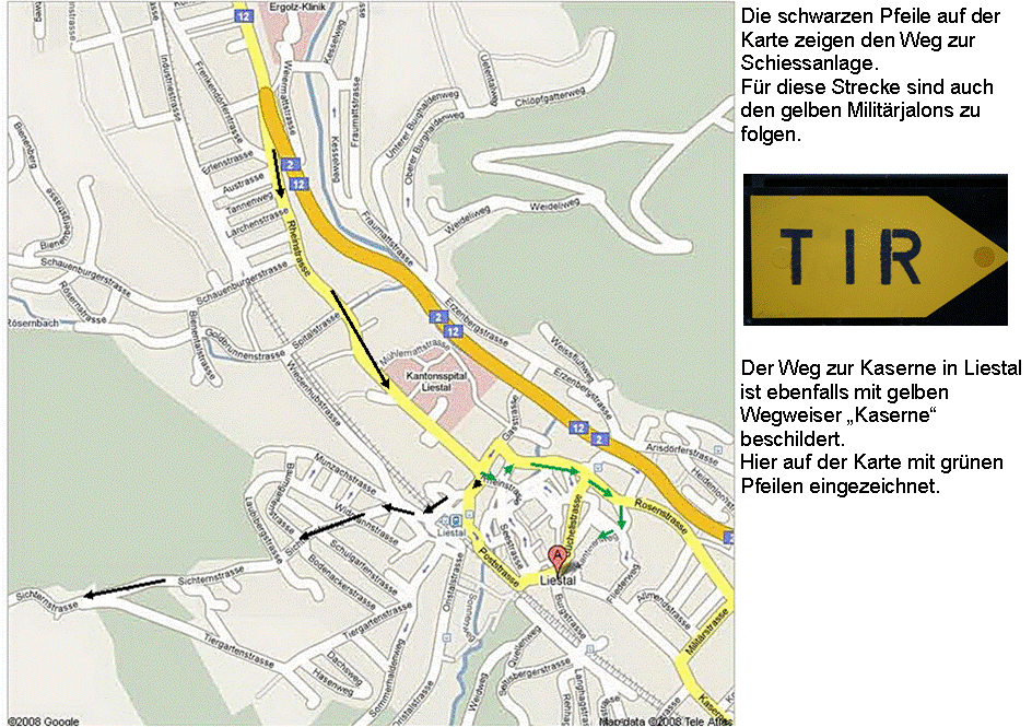 In der Stadt Liestal gibt es gelbe offizielle Wegweiser mit der Beschriftung „Kaserne“ – zum Schiessstand die gelben Jalons „TIR“
